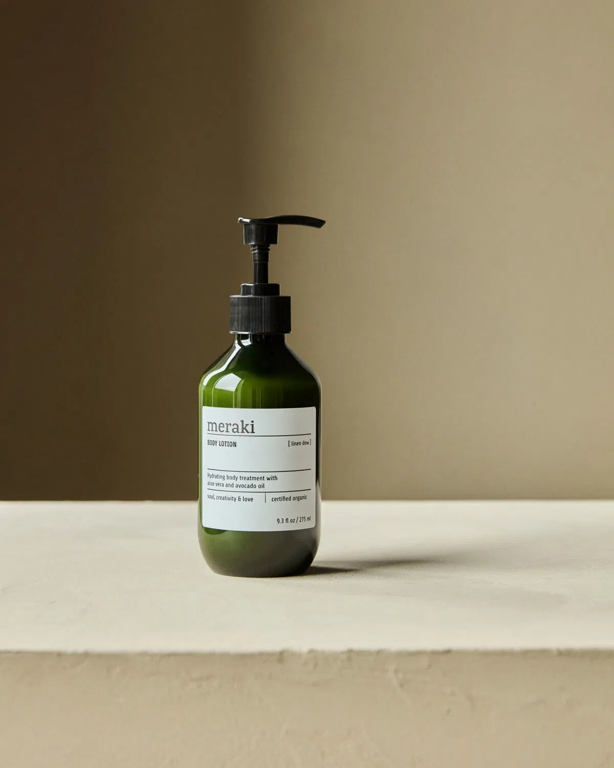 A body lotion that nourishes, moisturises and softens your skin. Linen Dew from Meraki is rich in organic ingredients such as cocoa butter and avocado oil which also contributes with vitamin E, an antioxidant. Certified COSMOS organic by Ecocert.