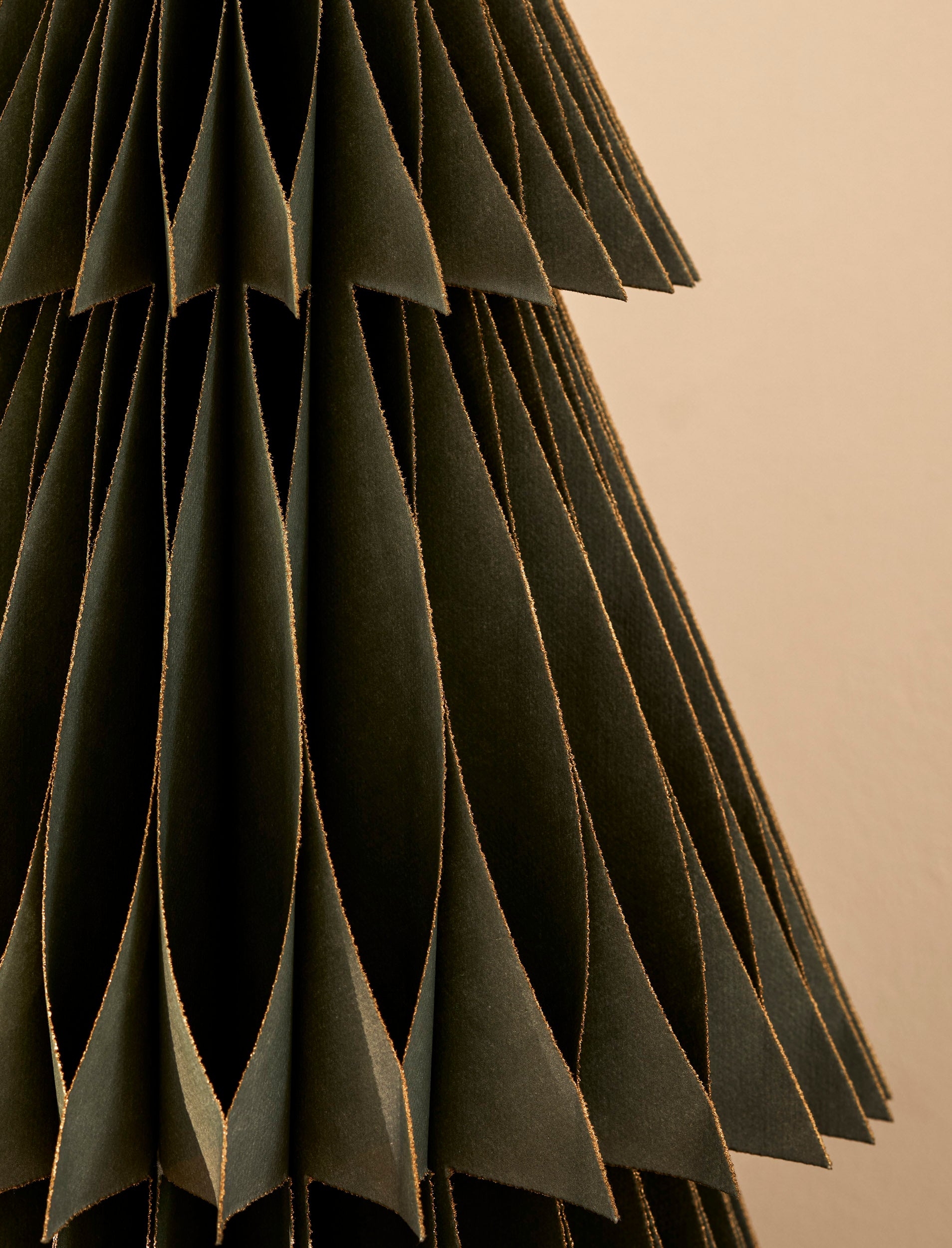 Conjure up instant festive spirit by folding out this freestanding paper christmas tree. This large-sized rosemary green version is edged with gold for an eye-catching effect, and its modern style puts a contemporary twist on old-fashioned paper Christmas decorations. It’s easy to assemble thanks to its three magnet catches, and easy to store because it folds away flat. For a delightfully festive display on a table centrepiece, windowsill or mantelpiece, group it together with other decorations in different sizes and colours.
